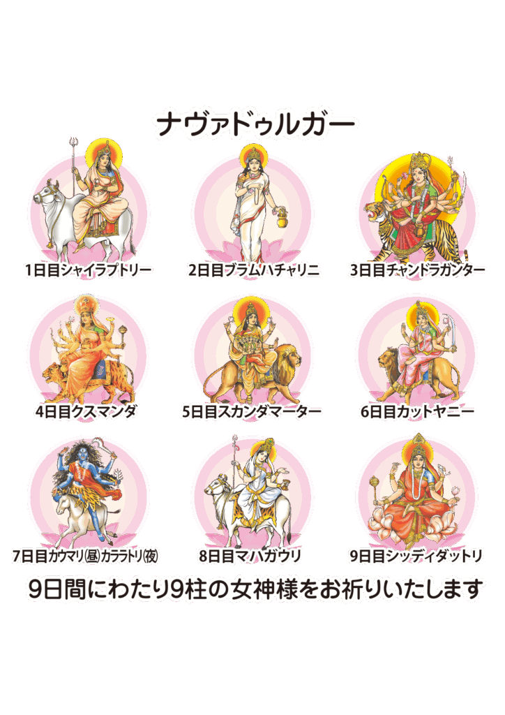ドゥルガー女神はマザーデバインが姿となって現われた女神様です。ドゥルガー女神が9つの女神に姿を変えて、私達のそれぞれに最もピッタリの愛、恩恵、力、能力、導き、進化を授けてくださります。